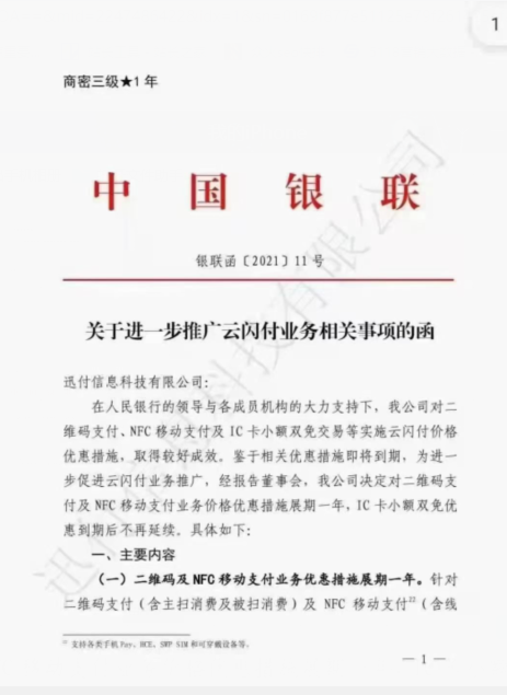 近日, 中國銀聯發布關于進一步推廣云閃付業務相關事項的函, 在人民銀行的領導與各成員機構的大力支持下,我公司對二維碼支付、NFC移動支付及IC卡小額雙免交易等實施云閃付價格優惠措施,取得較好成效。 鑒于相關優惠措施即將到期,為進一步促進云閃付業務推廣,經報告董事會,我公司決定對二維碼支付及NFC移動支付業務價格優惠措施展期一年,IC卡小額雙免優惠到期后不再延續。 具體如下: