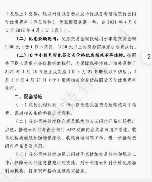(三) IC卡小額免密免簽交易價格優惠措施不再延續 按照線下刷卡消費業務價格標準執行,為保障穩妥實施,相關調整于2021年4月28日起正式實施(即4月27日晚銀聯日切后),4月6日至4月27日(含)期間相關交易仍按照云閃付優惠費率執行。