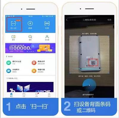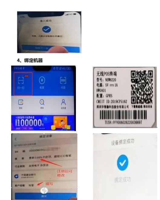 2.3機器綁定:打開APP,首頁的掃一掃→掃描機器背面條形SN→按提示步驟做身份檢測(人臉識別)→同意代收服務費點擊確定→成功綁定設備之后就可以首刷激活